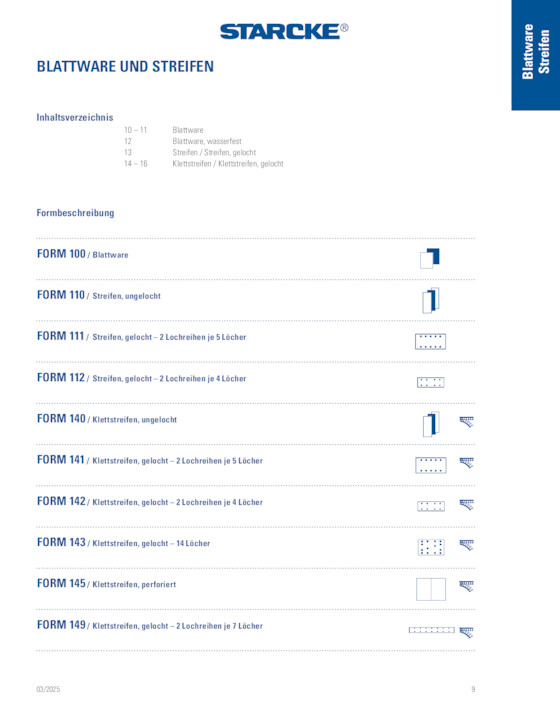 Form 100 / Blattware Form 110 / Streifen, ungelocht Form 111 / Streifen, gelocht – 2 Lochreihen je 5 Löcher Form 112 / Streifen, gelocht – 2 Lochreihen je 4 Löcher Form 140 / Klettstreifen, ungelocht Form 141 / Klettstreifen, gelocht – 2 Lochreihen je 5 Löcher Form 142 / Klettstreifen, gelocht – 2 Lochreihen je 4 Löcher Form 143 / Klettstreifen, gelocht – 14 Löcher Form 145 / Klettstreifen, perforiert Form 149 / Klettstreifen, gelocht – 2 Lochreihen je 7 Löcher